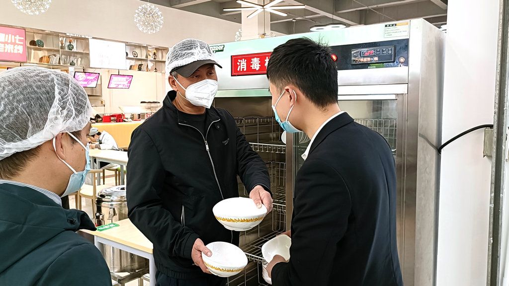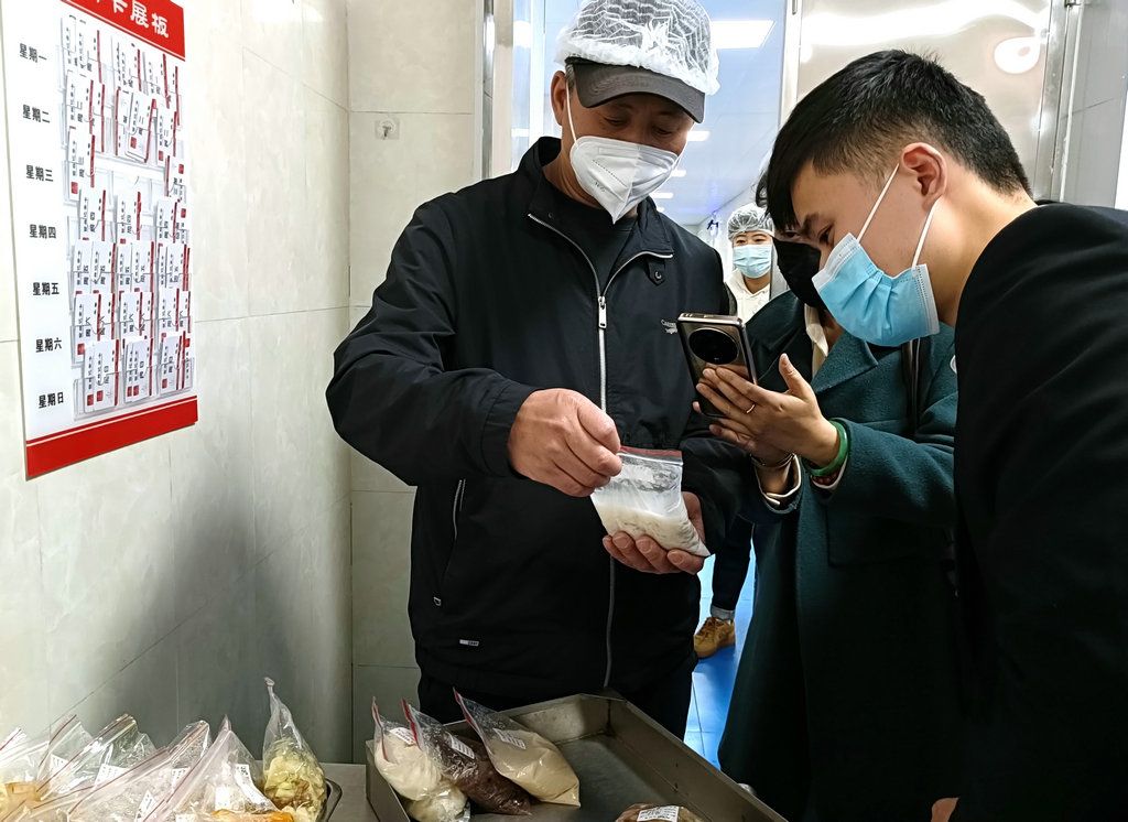 在北苑一楼和二楼食堂,蔡玉波直奔食堂后厨,检查餐具清洁和消毒情况、食材新鲜程度、餐食制作卫生状况、食品留样规范性等。在餐具清洁消毒区,他详细询问工作人员餐具清洗消毒流程,拿起清洗后的餐具仔细查看是否还有残渣污渍,检查消毒柜是否正常运转。在食材存放区,他俯下身子,认真查看蔬菜、肉蛋、粮油有无腐败变质的情况,查看标签上的时间等信息。在食品加工区,他要求工作人员务必要保持清洁卫生,确保师生吃得安全、吃得放心、吃得健康。在食品留样间,他拿起一袋袋留样食品,查看留样的品类、时间和规范性。