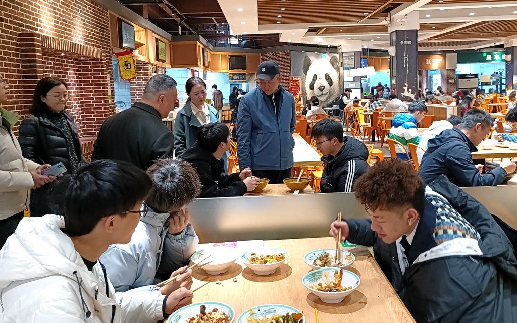 在南苑食堂,蔡玉波巡视了各窗口餐食情况,向同学们详细询问 “有没有吃到变质食品?”“有没有吃坏肚子的情况?”“在食堂吃得饱吗?”,等等,认真听取了同学们对食品卫生状况的反馈和就餐感受。
