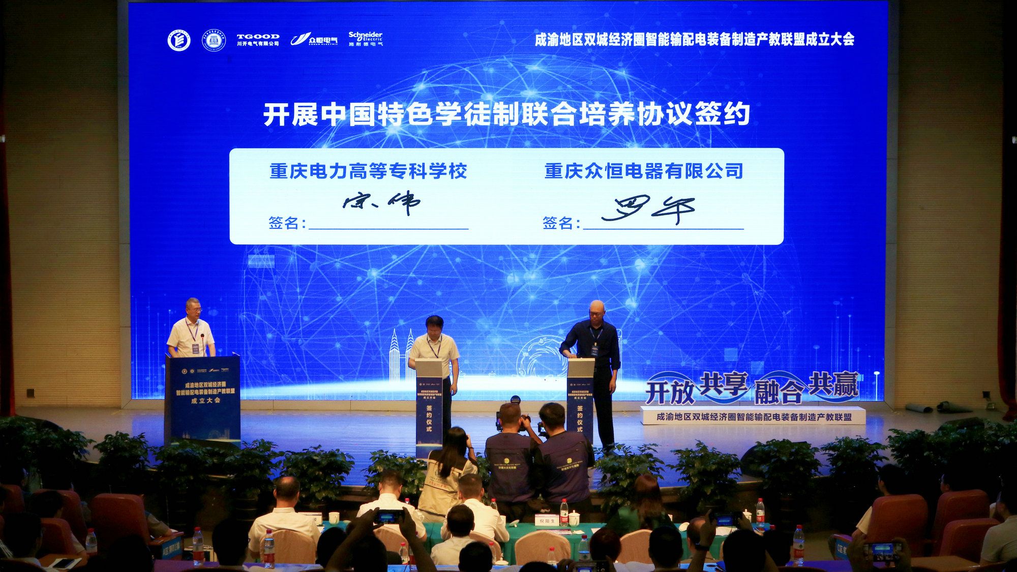 联盟成立大会后,举行了bwin手机客户端与施耐德电气校企合作、与川开电气合作共建智能输配电装备制造产业学院,重庆电专与重庆众恒电器开展中国特色学徒制联合培养协议、与ABB(中国)共建ABB电气数字化工程师学院等4个校企合作项目签约仪式,举行了bwin手机客户端与川开电气开展中国特色学徒制联合培养拜师仪式,川开电气还向学校捐赠了一批价值150万元的智能电气成套实训设备。会前举行了bwin手机客户端法国施耐德电气绿色低碳技术应用中心揭牌仪式。
