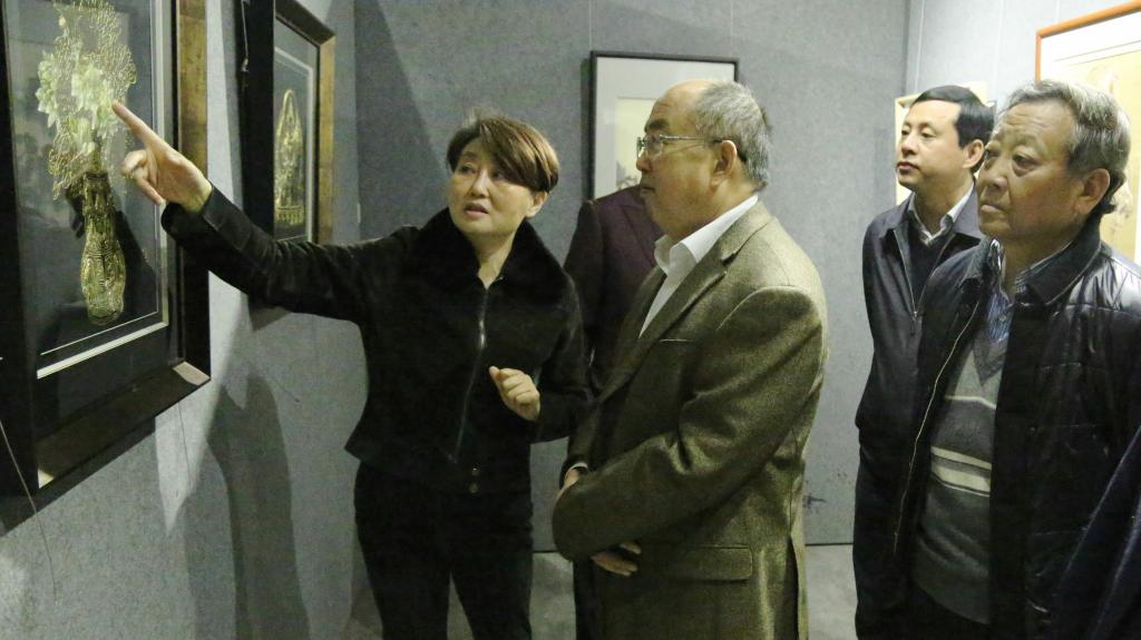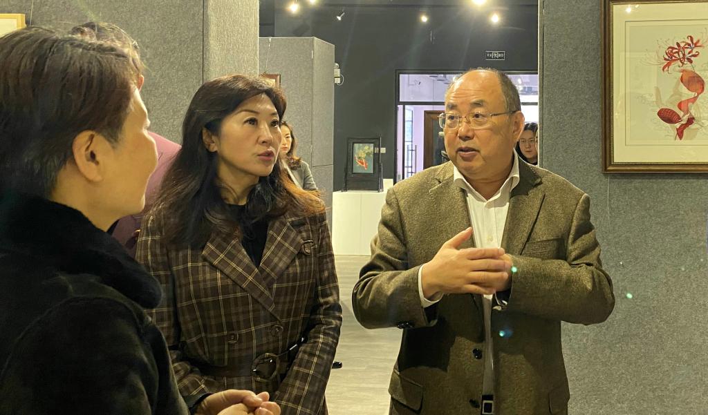 在蜀绣中心,国务院特殊津贴获得者朱利容教授带领客人参观了绣艺苑馆藏精品,介绍了馆内历届学生作品。郑会长对学校“大师+教授”的非遗师资队伍建设给予肯定,同时希望蜀绣能融入其他非遗元素,创新出符合时代审美的非遗作品,在引发年轻人共鸣上多做探索。