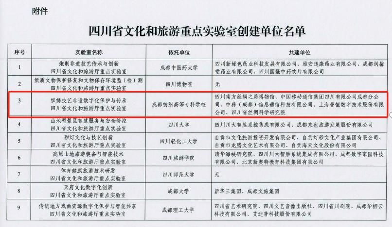 4月22日,四川省文化和旅游厅公布四川省文化和旅游重点实验室名单,bwin手机客户端“织绣技艺非遗数字化保护与传承四川省文化和旅游厅重点实验室”成功获批。