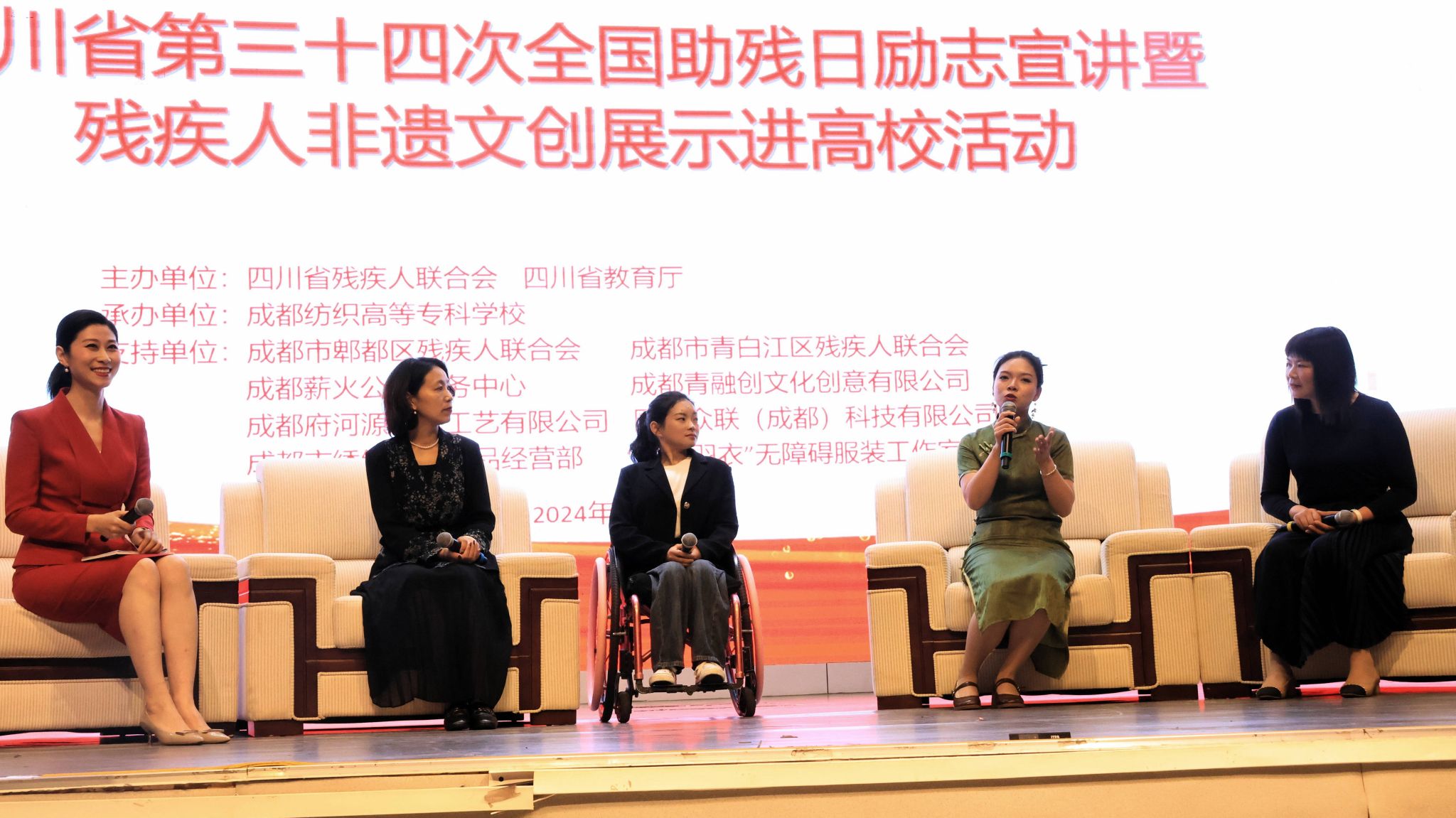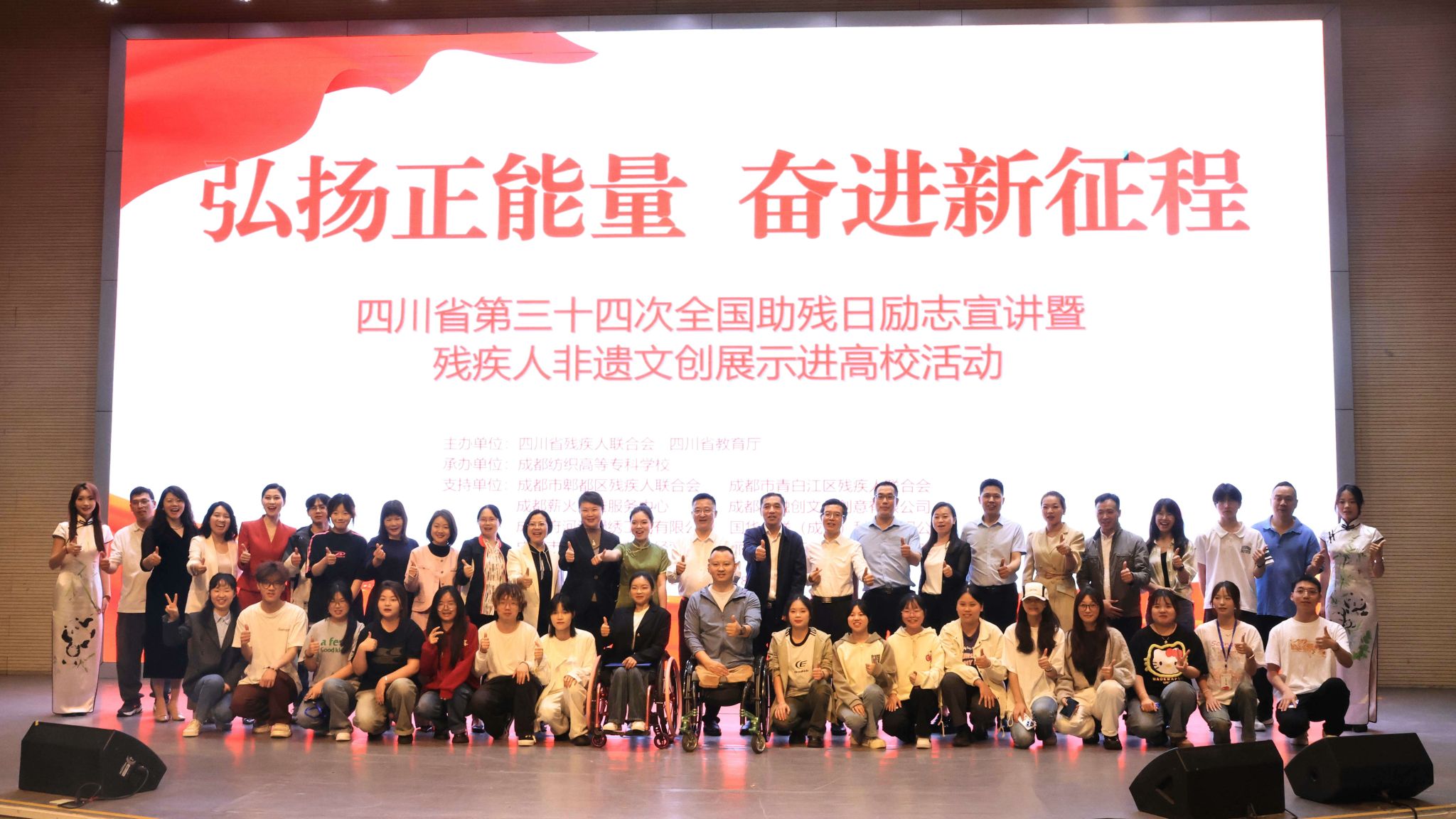 5月8日,“弘扬正能量·奋进新征程”四川省第34次全国助残日励志宣讲暨残疾人非遗文创展示进高校活动在bwin手机客户端举行。省残联副理事长黄卫德、省教育厅职教处副处长王华讲话,强调加强成纺“非遗传承+助残就业”经验的总结与应用推广。校长孙锐介绍了成纺职教助残理念与举措,并从黄卫德手中接过“四川省残疾人大学生创业孵化示范单位”荣誉牌匾。四川残疾人励志报告团、国华众联(成都)科技有限公司分别向bwin手机客户端服装设计与工艺专业在读残疾学生张晓丽颁发报告团成员和签约设计师证书。活动由四川广播电视台陈鸿主持。