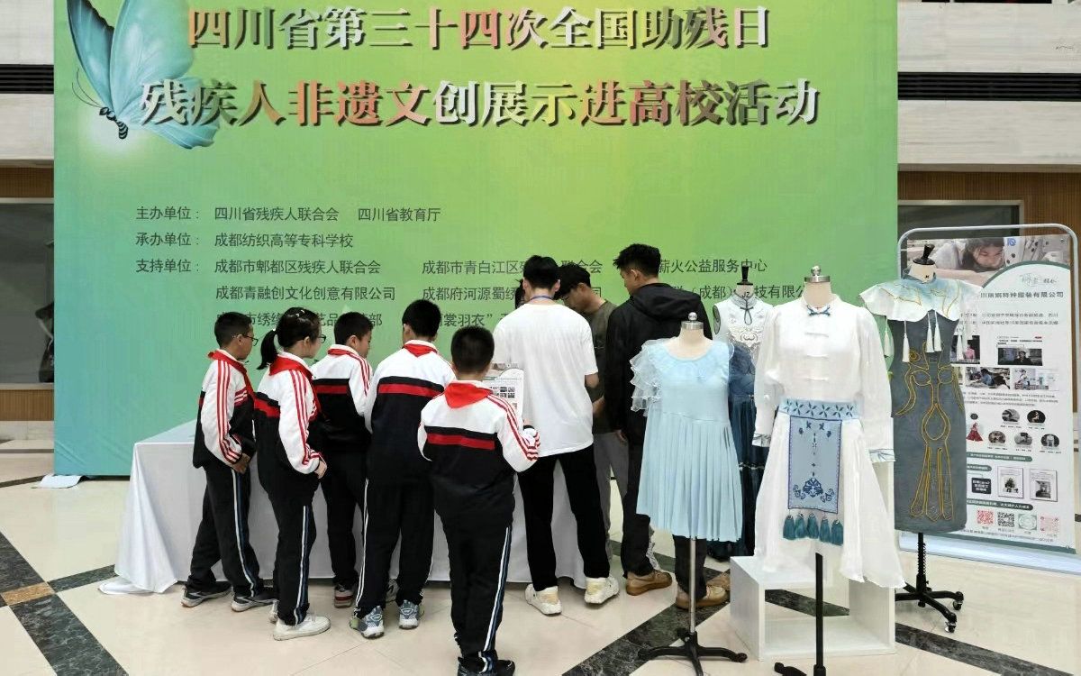 在图书馆一层大厅,郫都区、青白江区残联组织部分残疾人非遗文创作品开展了集中展示活动。精美的民族服装、无障碍服装、钩织作品、蜀绣屏风、文创羌绣、竹编茶具等作品,令观展的领导和师生叹为观止。