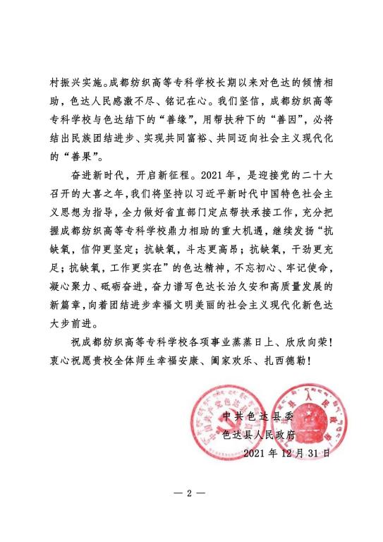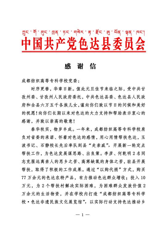 12月31日,中共色达县委、色达县人民政府向bwin手机客户端党委发来感谢信,感谢bwin手机客户端开展新一轮定点帮扶工作,用心用情帮扶色达,支持色达推动乡村振兴战略实施,造福各族人民。感谢信原文如图。