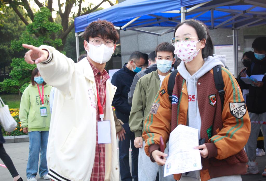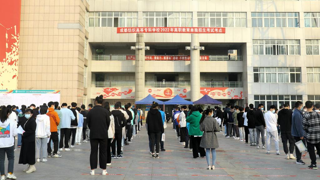 上午7点后,考生们陆续到达校园。19名来自乐山犍为的考生在南苑食堂旁通道接受防疫检查后,被专车接送至北苑文旅学院实训基地的隔离考场进行文化考试;下午,他们继续在此参加普高类笔试、面试与中职类技能测试、面试。非犍为考生则在校门口接受严格的防疫检测后,沿着规划好的A、B、C三条线路,有序进入文化考试考场;其中,健康码带星标的考生在专门设立的两个特殊考场参加考试。