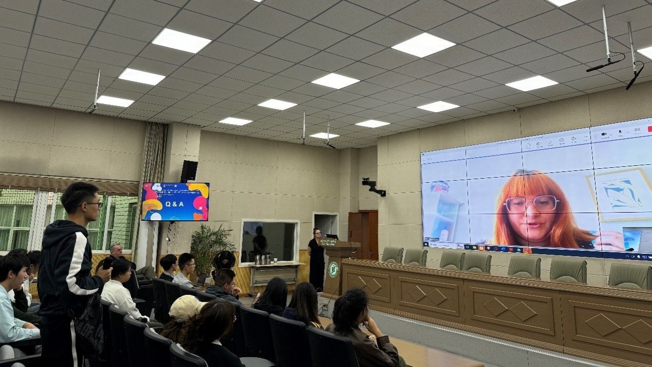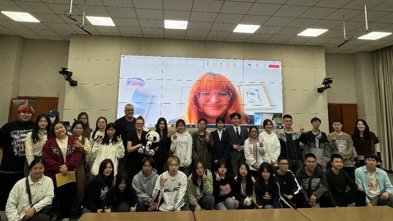 接下来,英国南埃塞克斯学院、中英合作办学项目英方教师Vicky和Beth线下+线上互动,为学生们呈现了一场题为“自由全职设计师”的讲座。Beth老师在英国连线为学生分析自由设计师与全职设计师在职业范围内的优势与劣势,作为自由设计师所需的技能技巧,如何提升个人职业技能,以及如何做好个人宣传、寻找潜在客户等。Beth在论坛最后强调,除了多与同行交流,保持设计灵感外,独立设计师还需考虑全球化、环保等因素。在提问答疑环节,学生与两位外籍教师积极互动,对服装的全球化趋势、设计师职业生涯规划、进一步出国深造等话题进行了深度交流。讲座气氛活跃,现场互动热烈。