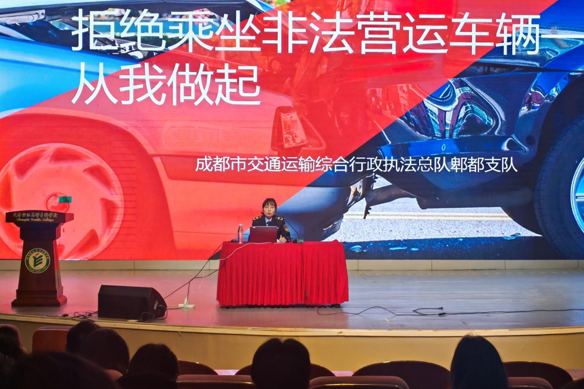 4月23日上午,学校邀请成都市交通运输执法总队郫都支队吴柠伶警官到校,为师生开展“拒绝乘坐非法营运车辆从我做起”交通安全专题讲座。活动由保障处牵头,党委宣传统战部、学创处协办。讲座由保障处副处长刘国柱主持,400余名师生代表参加。