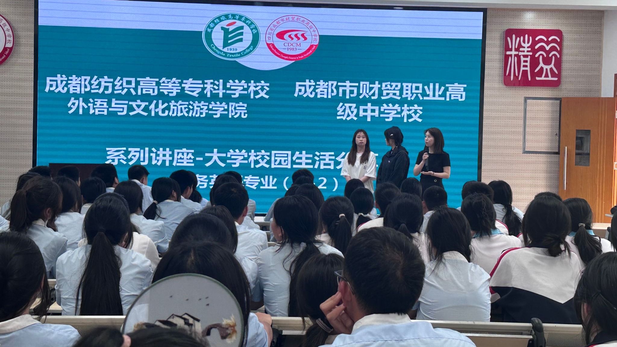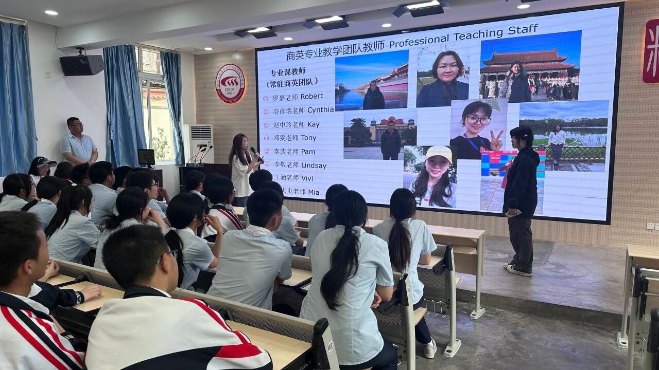 胡贞贞老师为即将升入bwin手机客户端的“3+2”中高职衔接班学生介绍了bwin手机客户端犀浦校区与邛崃产教园区的全貌,包括美丽的校园环境、舒适的生活学习条件,以及商务英语专业人才培养方案和同学们未来的职业规划等。“云上栀子”社团负责人、商英221班的何思雨与陈安莉同学和财贸职高的学子们互动交流,分享大学学习生活的体会,回答了来自“3+2”班三个年级近70名学生的提问,现场的互动活动气氛轻松快乐。