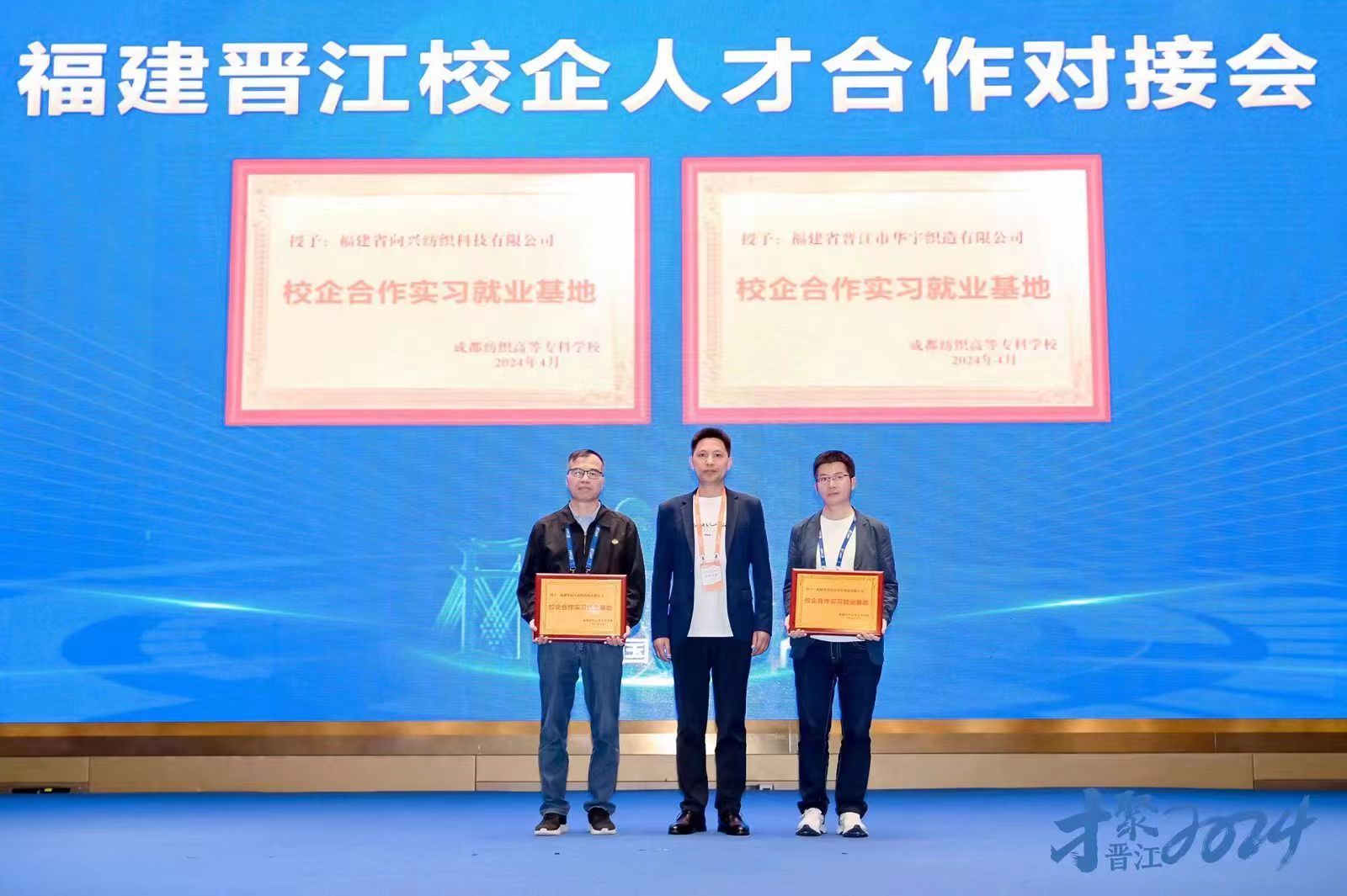 会上,蒲冰远代表学校向福建省向兴纺织科技有限公司和福建省晋江市华宇织造有限公司授予“校企合作实习就业基地”铜牌,并代表学校作交流发言,感谢福建省晋江市人民政府、晋江市人社局为广大学子搭建的就业平台,感谢福建省晋江市的企业为毕业生们提供成长成才的岗位,让学校有机会为地方产业经济发展贡献学校智慧和力量。他介绍了学校办学历史、育人特色、专业优势、未来规划等,并分享了学校与晋江市代表企业的合作经验,以及在福建省内就业的优秀校友代表的情况。