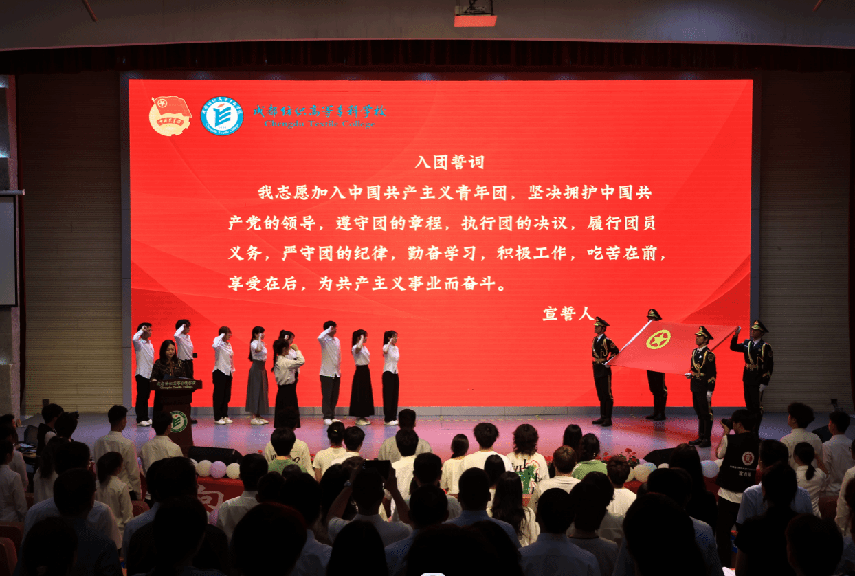 大会现场还举行了入团仪式。各学院团总支书记为新发展团员佩戴团徽;新发展团员面向团旗,庄严宣誓。