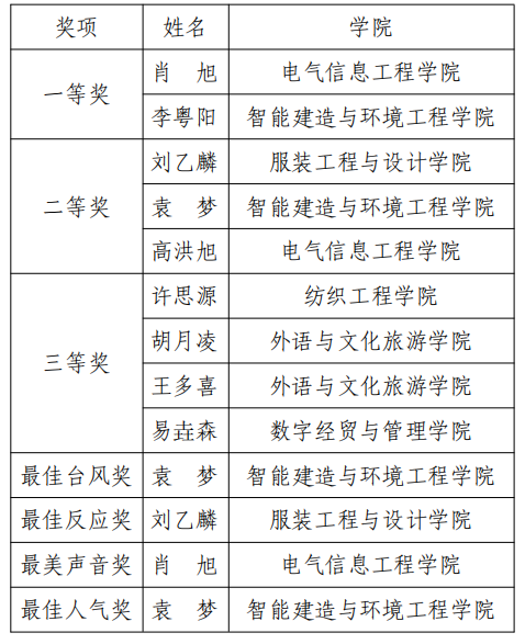 比赛最终评出一等奖2名、二等奖3名、三等奖4名及最佳台风奖、最佳反应奖、最美声音奖、最佳人气奖各1名。李琳对比赛作点评,她强调:一是要拓宽知识面,积极关注时事、民生、文化科技等知识,培养多元化主持能力;二是要多参加学校各类活动,在活动中锻炼自己、提升自己。