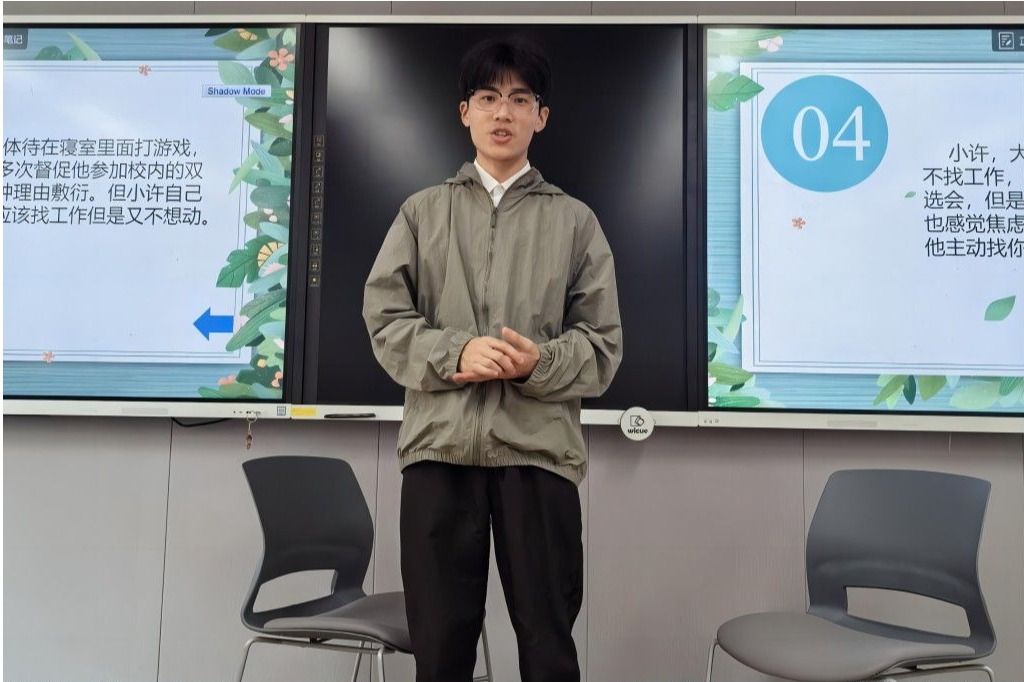 决赛采用朋辈心理辅导场景模拟方式进行。参赛选手根据具体情景,对同学遇到的问题进行分析和沟通,交流完成后,作1分钟总结,主要考察选手临场应变能力和朋辈辅导技巧。经过激烈比拼,服装学院服普233班李林聪同学获得一等奖,服装学院服普233班木宇阳同学、文旅学院研学231班罗紫恬同学获得二等奖。