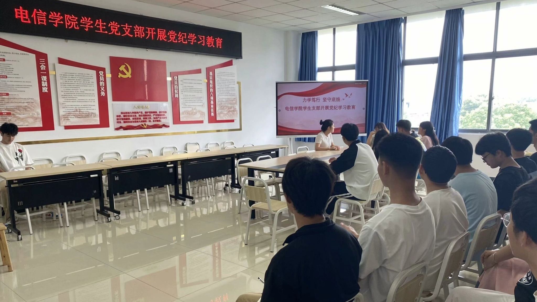 7月1日,电信学院学生支部以“力学笃行·坚守底线”为主题开展党纪学习教育。本次学习教育由学院学生第一支部书记敬珊主讲,学生党员、入党积极分子、发展对象共同参加。