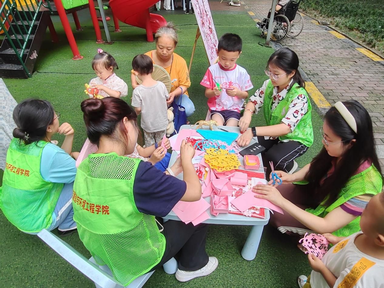 社会实践团队在带领犀浦村小朋友体验剪纸文化