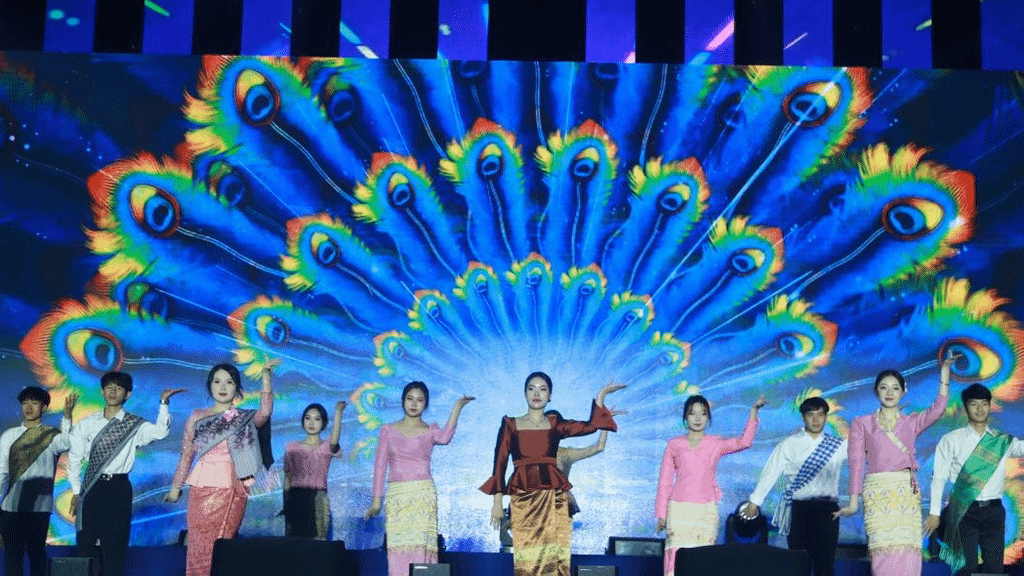 整场演出分为“光辉岁月”“梦想启航”“携手同行”三个篇章。节目通过多元化的艺术手法,展现了深厚的家国情怀、传统文化的独特韵味,以及成纺学子昂扬向上的青春风貌。一首由男生合唱的《少年赋》配上激昂的鼓声,充满力量和激情,唱出了少年强则国强的气势。师生们共同演绎的《扬帆起航》,火红的绸扇如同初生的朝阳,表达了对新生的美好祝愿。bwin手机客户端学生表演的《入画江南》和《寮韵曼舞》,向我们展示了中国古典舞蹈与老挝传统舞蹈的魅力,这是一场中外文化交流的盛宴。各学院师生带来的朗诵《75载光辉路 青春筑梦新征程》,用声音传达对祖国的热爱,用语言激励新一代纺专青年。模特们表演的《衣起“Show”》将晚会推向高潮,别具匠心的设计,充分展现出bwin手机客户端积极探索中华民族传统文化元素与现代服装融合的实践路径。