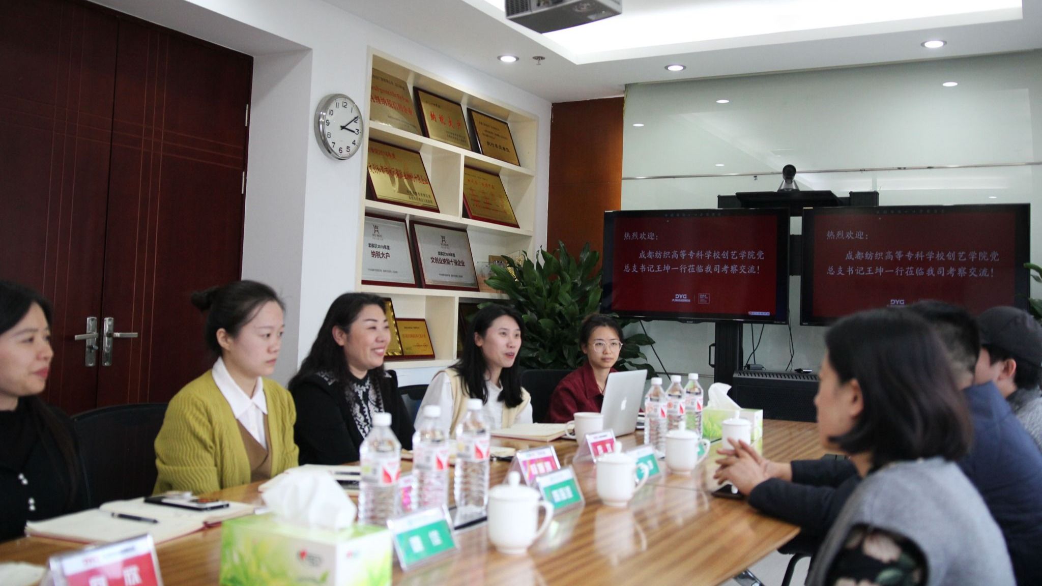 杨媛雅热情邀请学院加入成都市广告协会,大力支持协会智库建设,并强烈表达了在校、行、企深度合作,共同推动会展、文创等项目落地方面的合作意愿。庞欢详细介绍了大禹传媒集团的发展历程、主要业务、人才需求等情况,希望通过搭建校企合作平台,吸引更多的优秀毕业生来企业发展。