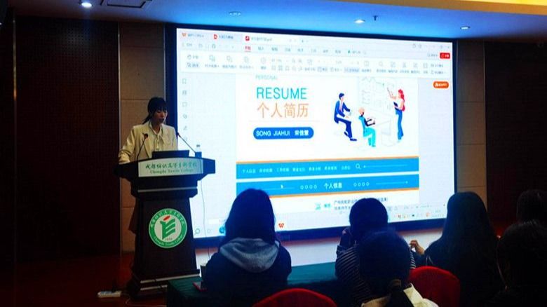 何老师的讲座从简历常见问题解答、简历设计的常见形式及设计要点、 “吸睛”简历的设计诀窍(配色、排版、结构)、通过学习“软件通”平台免费课程提高简历设计制作水平等方面展开。她强调,一份优秀的简历应当呈现的基本内容和格式规范等。何老师以其丰富的行业经验和深厚的专业知识为基础,着重从“简历设计常见问题”“如何有效制作一份吸引人的简历”和“在撰写过程中需要注意哪些细节”等方面进行了深入浅出的讲解。她不仅分享了许多实用的技巧和建议,还结合实际案例进行了生动形象的演示。
