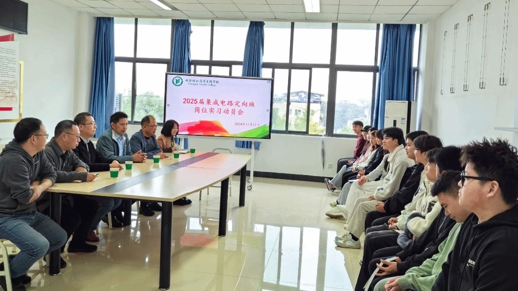 11月12日上午,bwin手机客户端在北苑笃行苑C410教室隆重举行2025届、也是成纺首个集成电路定向班同学的岗位实习出征仪式。副校长蒲冰远作动员讲话。轻材学院党总支书记申昕、电信学院党总支书记姚玲峰、学创处副处长刁家志、智造学院党总支副书记李敏和2025届集成电路定向班师生参加活动。