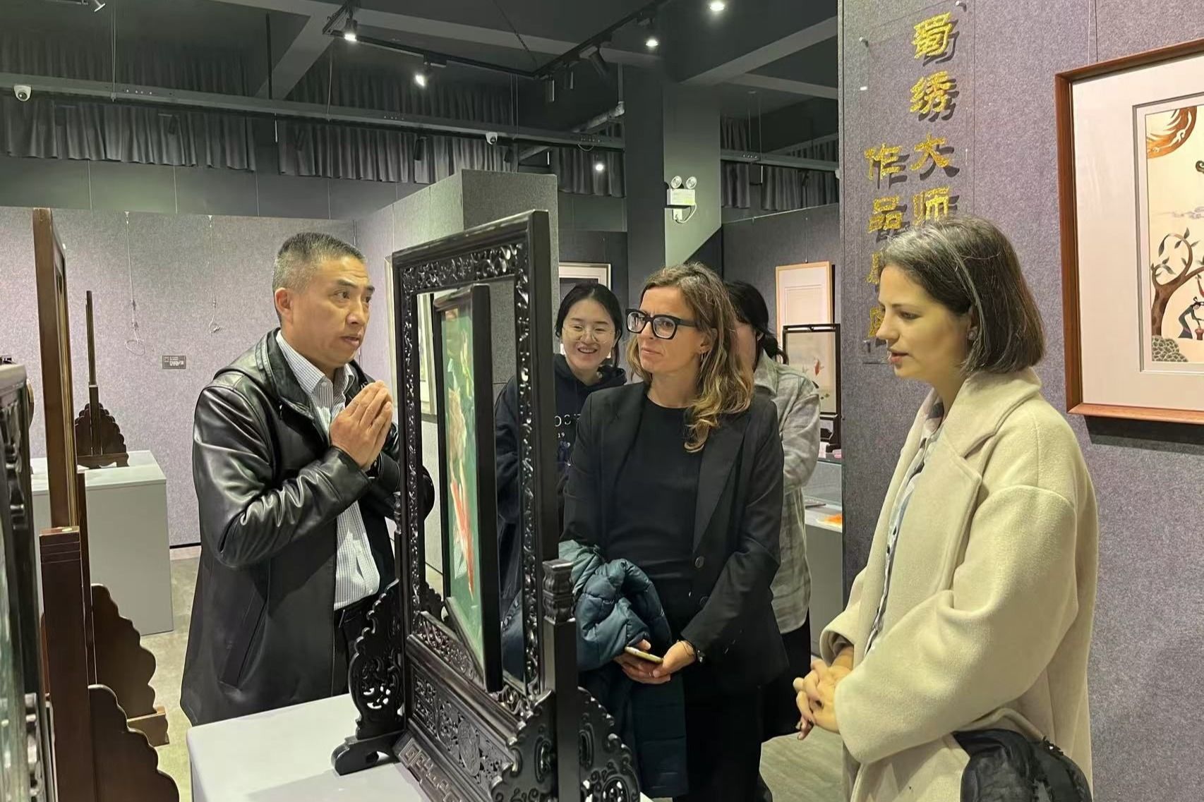 座谈会前,童晓晖陪同露西拉与维多利亚参观织绣技艺非遗数字化保护与传承四川省文化和旅游厅重点实验室,介绍了学校在蜀锦、蜀绣非遗文化传承创新方面开展的工作。