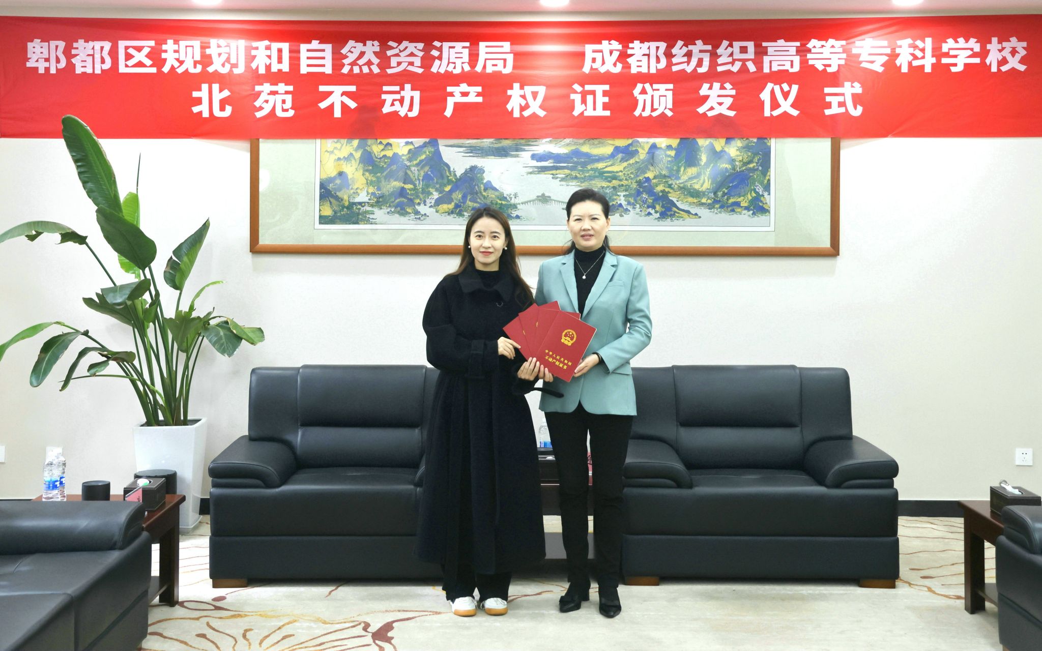 任迎伟和孙锐代表学校,对中共郫都区委、区政府、区规自局、区住建局和不动产中心给予学校不动产权证办理工作的支持表示感谢。
