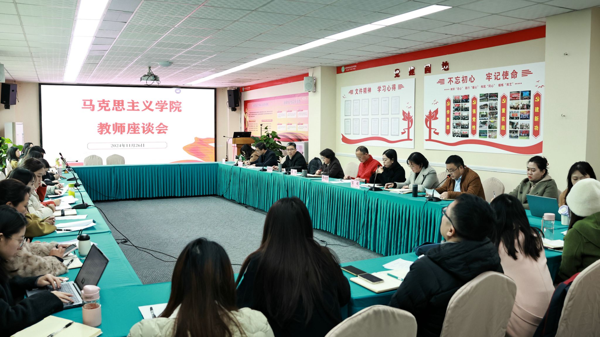 人事处处长李远贵、教务处副处长郭玲宏、全体马院教师参加座谈会。