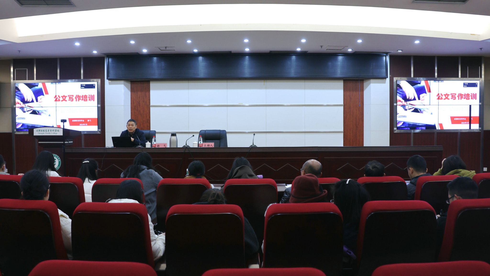 11月29日,由党政办牵头举办的行政人员素质能力提升之公文与写作培训在图书馆第四会议室举行,特邀成都市欧美同学会秘书长游弋到场授课。学校科级干部、专职组织员、各院(部)行政人员等80余名教师参加。培训会由党政办主任朱瑶主持。