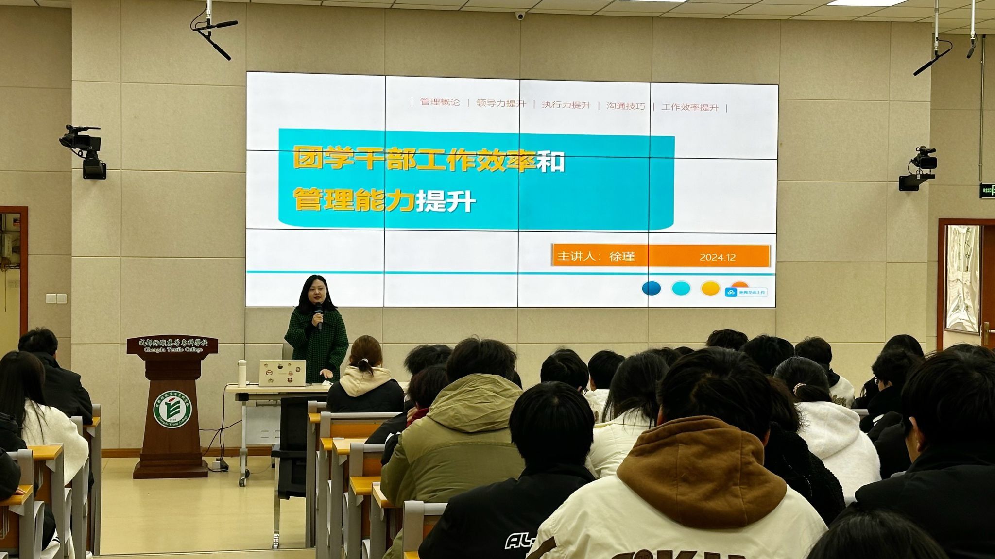 讲座中,徐瑾深入讲解管理的基本知识,将管理学的核心概念、要素拆解细化,结合电信学院团学工作实际,为干部们筑牢理论基础,帮助其明晰管理架构与职责,以便在组织活动、团队协作时精准发力。关于提升执行力,她列举大量校园活动筹备等团学工作中的真实案例,深度剖析执行力不足的症结所在,进而给出“制定明确计划、设立合理节点、及时复盘调整”等实操性极强的解决办法,引导团学干部克服拖延、提升行动力,确保工作高效落地。在高级沟通技巧板块,她模拟多场景互动,聚焦干部与同学、老师及其他部门交流场景,传授“有效倾听、清晰表达、共情反馈”技巧,助力干部们化解沟通壁垒,凝聚团队、高效成事。