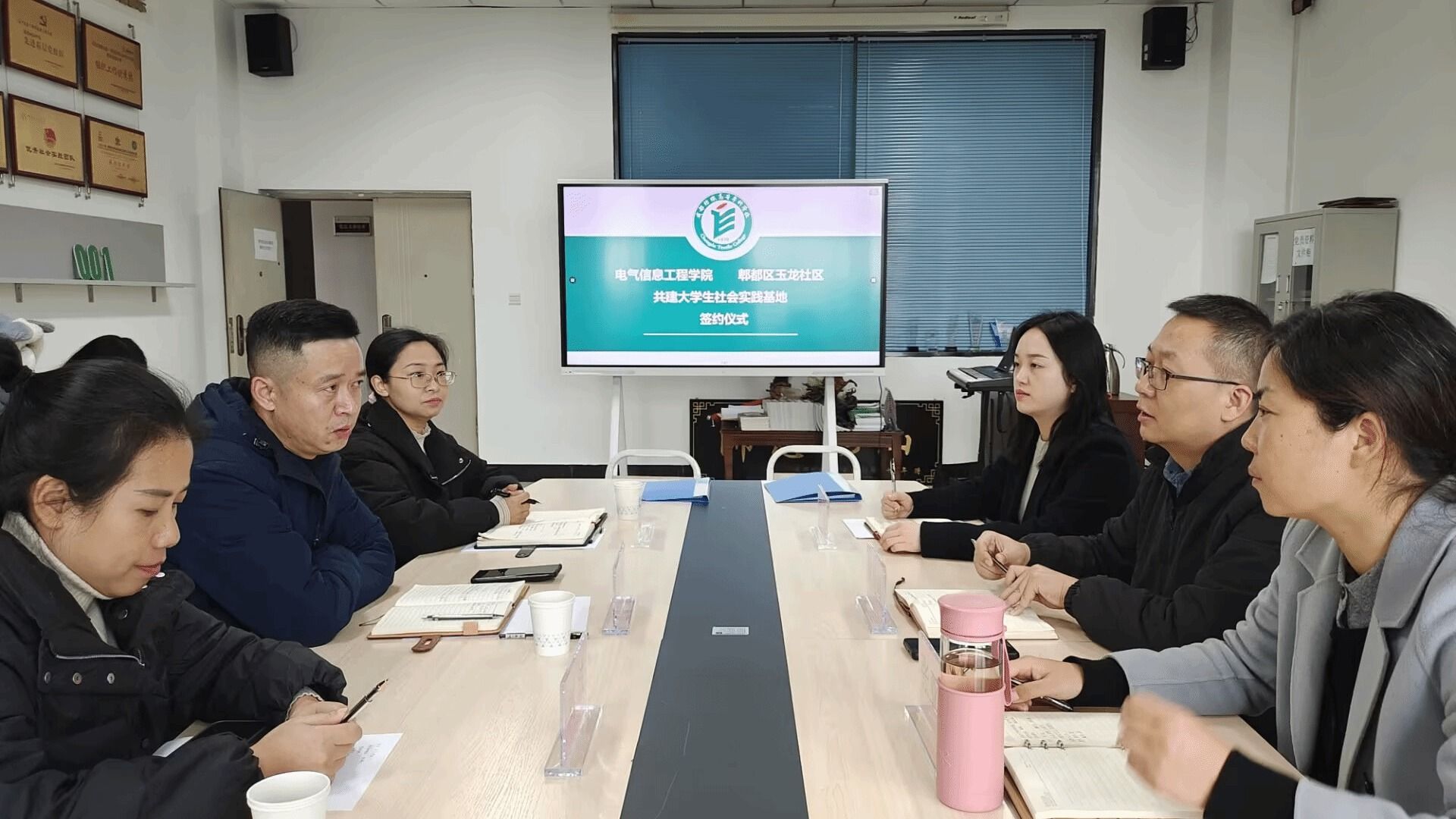 12月6日,电信学院与郫都区玉龙社区共建大学生社会实践基地签约仪式在北苑笃行苑C410举行。玉龙社区党委书记杨勇、党委副书记曾迪、社区党委委员刘波,电信学院党总支书记姚玲峰、党总支副书记兼团总支书记张亚茹、团总支学生会指导老师樊璠和25名学生代表参加签约仪式。