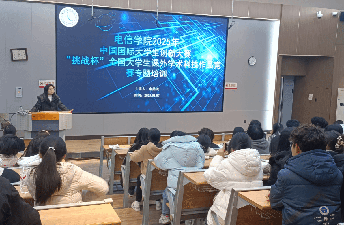 1月7日,电信学院在南苑致知楼C104举行2025年中国国际大学生创新大赛及“挑战杯”全国大学生课外学术科技作品竞赛专题培训,培养学生创新精神和创新能力,引导学生积极参与双创赛事。培训由学院负责创新创业的专职辅导员余茹茂老师主讲,大一、大二各班班长、学习委员及学生代表近100人参加培训。