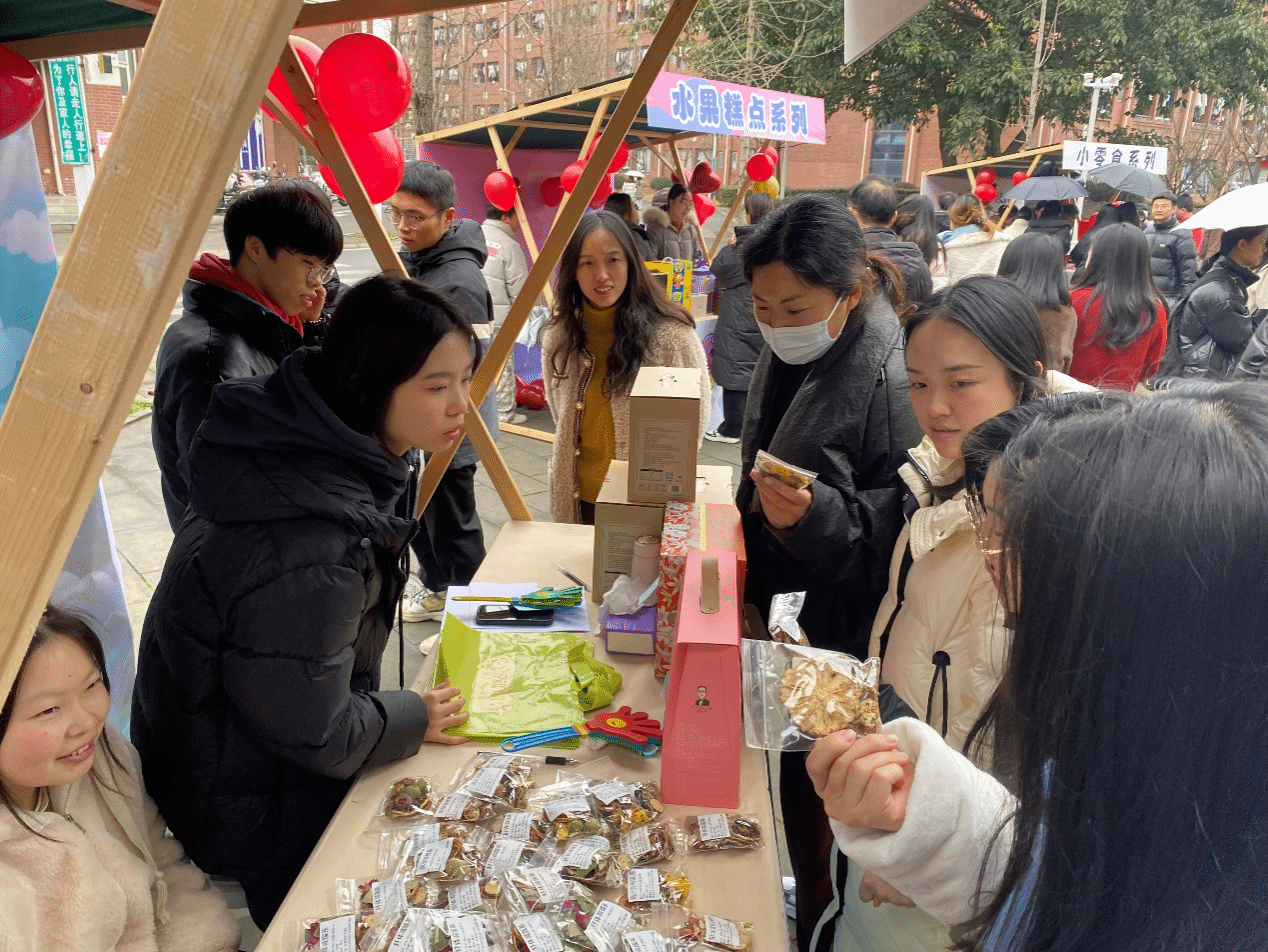 随着苏跃光宣布特色产品展销正式启动,现场气氛瞬间热烈起来。以年味为主题的糖果糕点、特色零食、酒水、滋补养生产品展位,吸引了众多师生驻足订购。供应链运营专业23级同学在现场积极引导,详细介绍产品特点与优势。