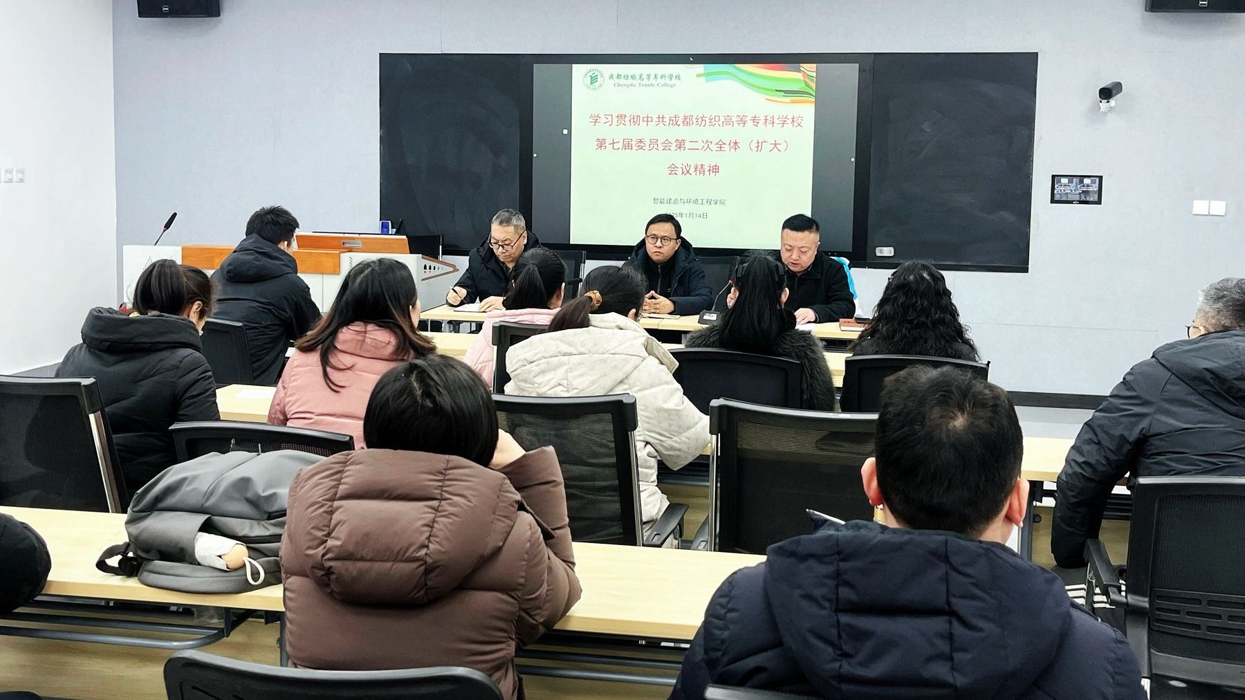 1月14日,智能建造与环境工程学院在行知楼A306召开教职工大会,集中学习中共bwin手机客户端第七届委员会第二次全体(扩大)会议精神。党总支副书记(主持工作)鲜金宏领学党委书记任迎伟作的《深入贯彻落实党的二十届三中全会精神 全力冲刺建成职教本科促推学校高质量发展》工作报告。