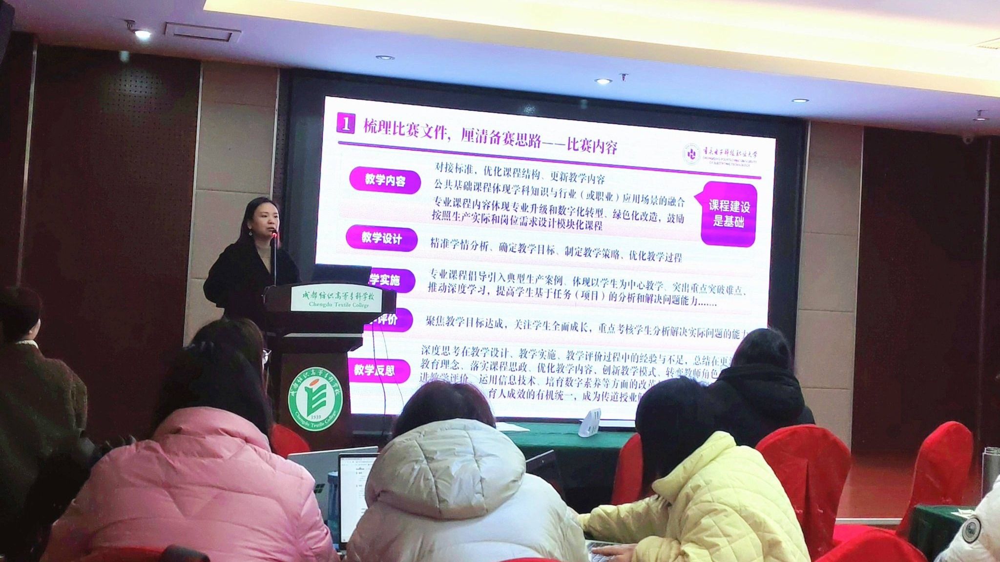培训中,牟教授围绕“梳理比赛文件、凸显职教特色、把握备赛技巧”三个方面进行讲解。她强调了研读比赛文件的重要性,让每位参赛教师对比赛规则和要求均有清晰的认识,厘清备战思路;结合具体案例,从课程建设、考核评价、课程理念等方面分析了如何打造优质金课;详细介绍备赛流程,帮助老师们从多维度深刻认知大赛,为赛事准备冲刺注入专业动能。牟教授还特别强调“以赛促教”的长效价值,鼓励教师将备赛过程中形成的项目化教学等创新模式反哺日常教学,实现竞赛与育人双向赋能。