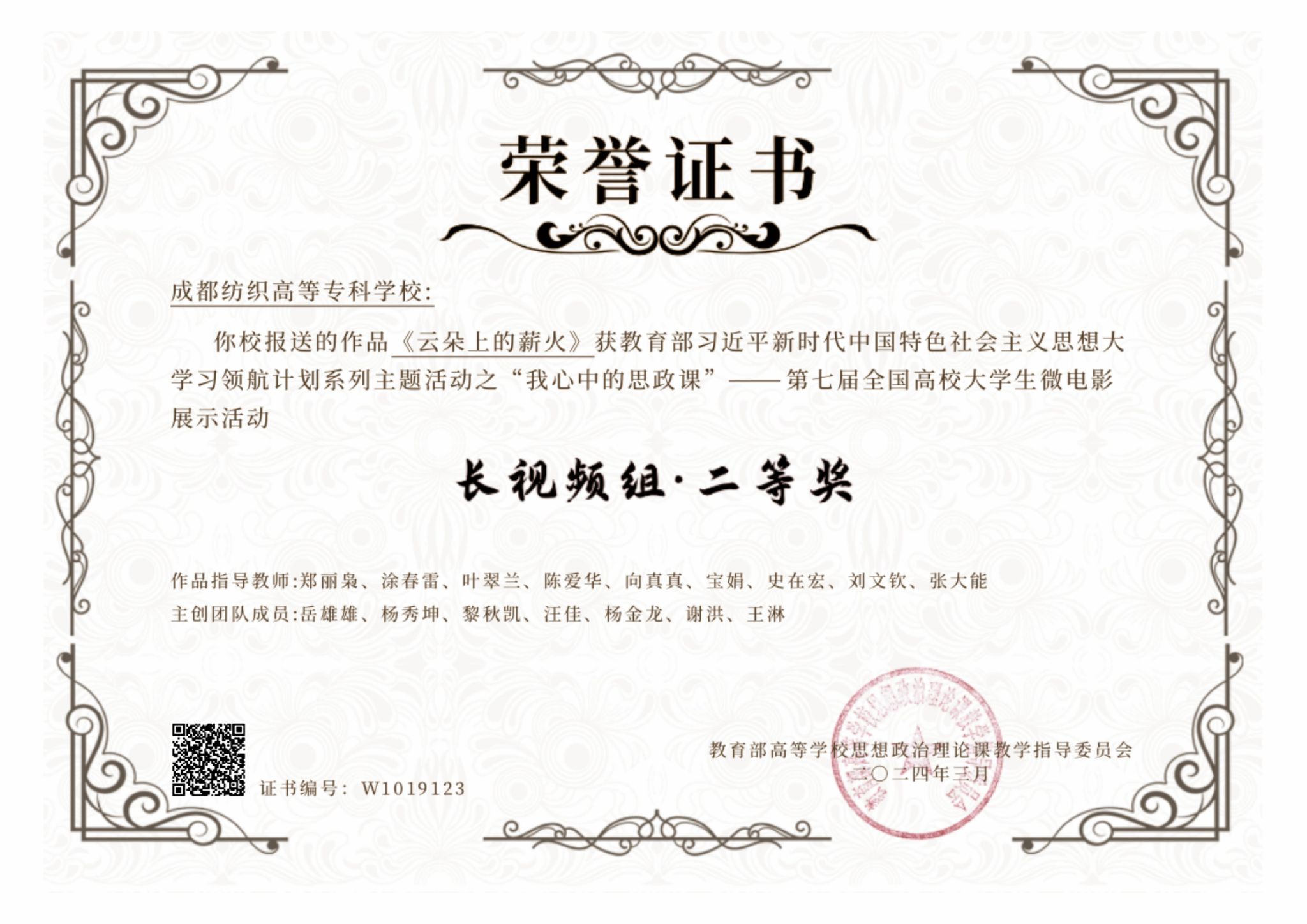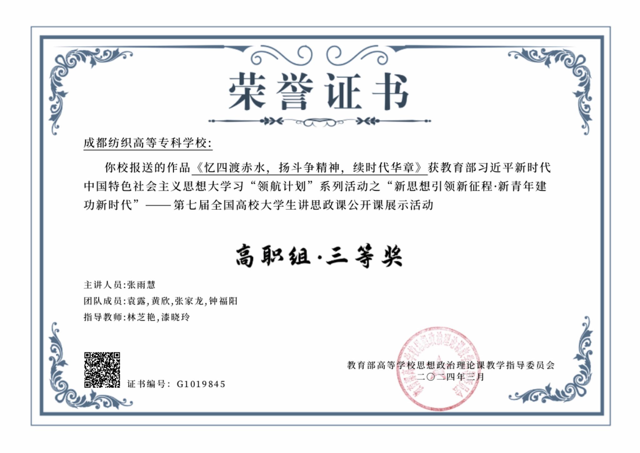 学校党委历来重视马院建设,学校党委常委会、校长办公会定期专题研究马院工作,学校党委书记直接联系马院,全面指导和支持学院建设。近年来,bwin手机客户端马院在学校党委和行政的坚强领导下,坚持“马院姓马、在马言马”的鲜明政治导向和办学原则,全面贯彻落实习近平总书记关于思政课是落实立德树人根本任务关键课程的要求,系统推进思政课改革和建设。在课程建设方面,学院高质量建成省级精品在线开放课程1门、省职业院校思政示范课程3门;在师资队伍建设方面,学院教师获评四川省优秀共产党员、四川省“四有”好老师、四川学校思政课教师年度人物等荣誉称号,学院漆晓玲教授领衔的教学团队分别获得省级课程思政示范教学团队和省级思想政治教育名师工作室立项,学院教师斩获全国高校思政课教学展示一等奖1项和省级“精彩一课”特等奖3项、一等奖1项;在实践教学方面,学院牵头打造“厚植衣被天下情怀·感悟纺织非遗之美”行走的思政课实践品牌,指导学生分别在第六届“我心中的思政课”微电影比赛中获全国二等奖,在第七届“我心中的思政课”微电影中获全国短视频组一等奖、长视频组二等奖,在第七届大学生讲思政课中获得全国三等奖,在大学生讲宪法比赛中获四川省二等奖。
