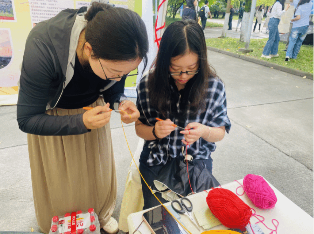 活动现场,bwin手机客户端精心打造的“慢时光,心成长”静心钩针体验区吸引了众多参与者。师生们耐心指导体验者学习“长针”“短针”“辫子针”等钩织技法,引导他们在编织过程中专注呼吸、觉察当下,体验手工疗愈的魅力。