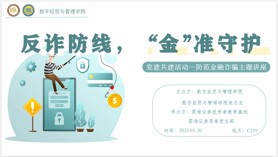 5月20日下午,数字经贸与管理学院在南苑致知楼C105开展党建共建系列活动之金融防诈主题讲座,以增强师生防范金融诈骗意识,提升自我保护能力。