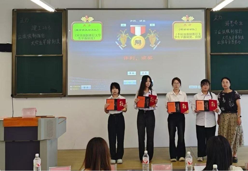 两场激烈的辩论后,经过现场评委打分,环艺242班代表队夺得冠军,建工专业代表队获亚军,建工243班代表队获季军,环艺专业代表队获第四名。颁奖环节,季俊玲老师为获奖的辩论赛队伍颁发荣誉证书和奖品。