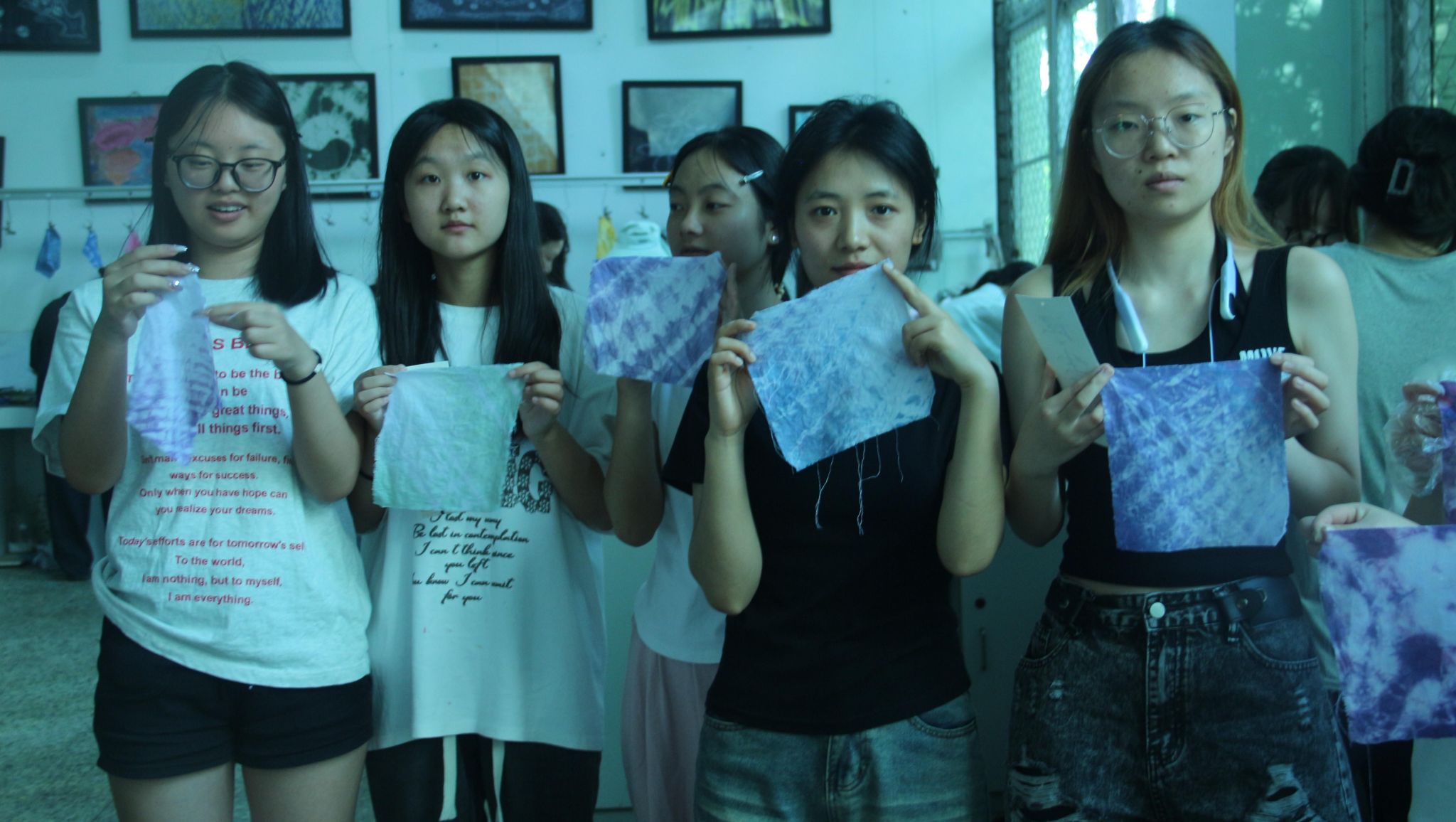 活动中,同学们在专业教师指导下系统学习扎染工艺的原理与核心技法,亲身实践折叠、捆扎、染色等关键步骤。同学们兴致盎然,尝试运用不同的折叠方式与捆扎力度进行创作,将素白布料浸入染料之中;拆解捆扎工具、展开布料之际,蓝白交织的独特纹样随即跃然呈现于布面。因个性化处理手法的差异,每件作品都呈现出独一无二的艺术效果,生动演绎了传统工艺精髓与现代创意灵感的碰撞之美。