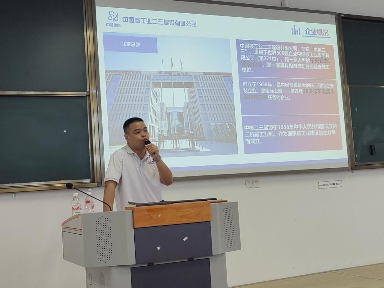7月1日,为提升学生就业质量,精准对接企业用人需求,搭建校企合作的桥梁,建环学院邀请中国核工业二三建设有限公司来校,在邛崃产教园区知著楼D101、D102教室开展订单班宣讲。建环学院工程造价、建筑工程技术、供热通风与空调工程技术三个专业的2023级全体学生参加宣讲会。