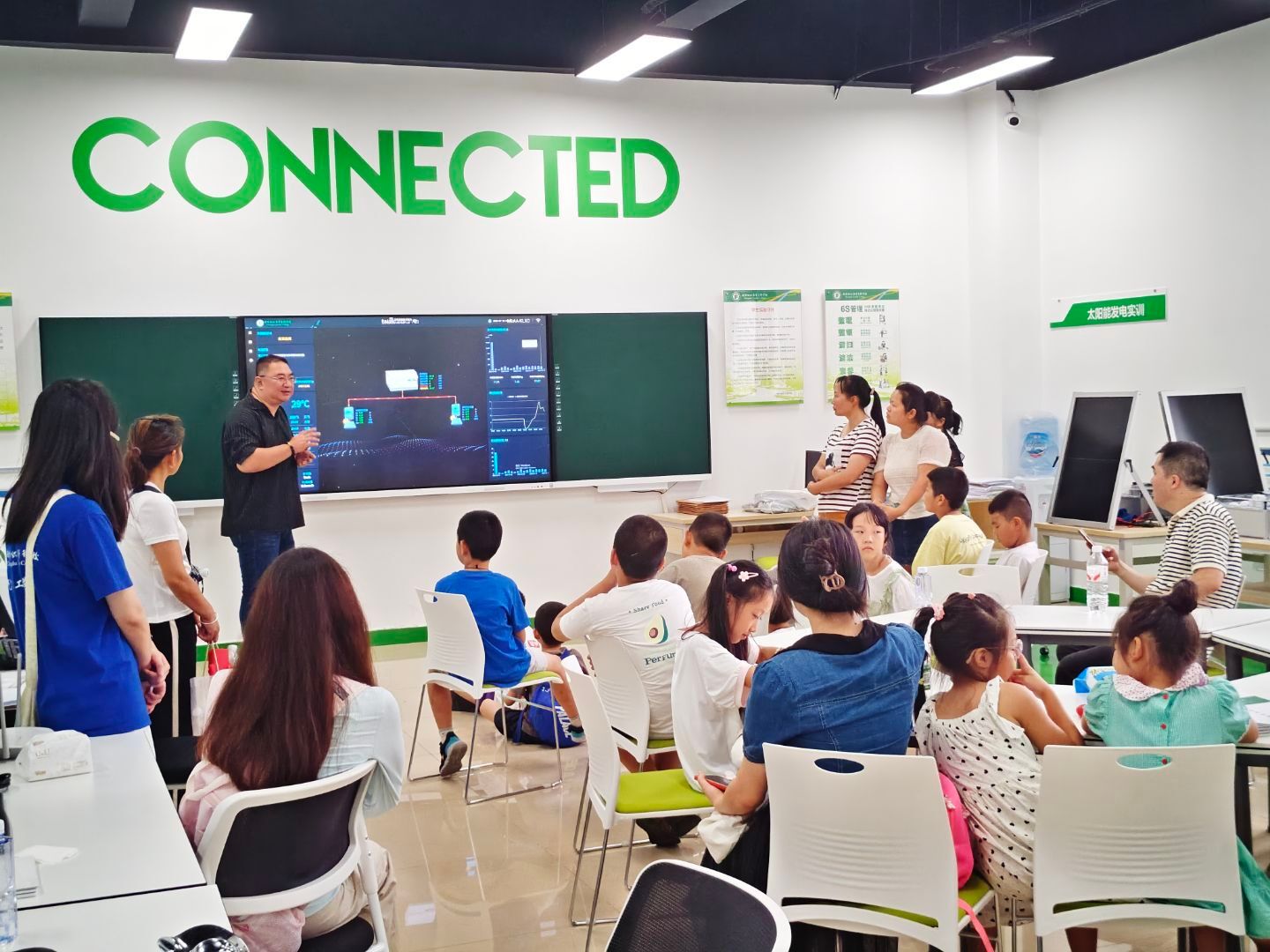 在电信学院法国施耐德电气绿色低碳技术应用中心,丁韬老师为小朋友们讲解电车的电源构造,介绍了新能源充电技术,如太阳能光伏板充电等,引发了孩子们的浓厚兴趣。大家围绕相关话题展开了热烈的交流与讨论。