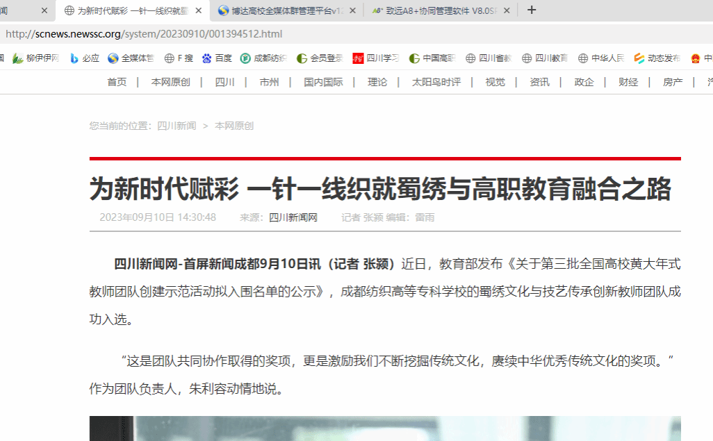 四川新闻网-首屏新闻成都9月10日讯(记者 张颍)近日,教育部发布《关于第三批全国高校黄大年式教师团队创建示范活动拟入围名单的公示》,bwin手机客户端的蜀绣文化与技艺传承创新教师团队成功入选。