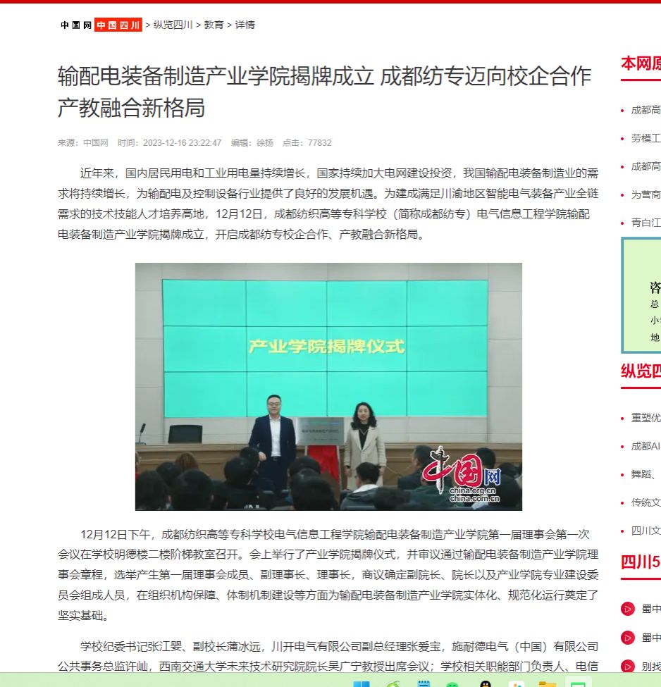 近年来,国内居民用电和工业用电量持续增长,国家持续加大电网建设投资,我国输配电装备制造业的需求将持续增长,为输配电及控制设备行业提供了良好的发展机遇。为建成满足川渝地区智能电气装备产业全链需求的技术技能人才培养高地,12月12日,bwin手机客户端(简称成都纺专)电气信息工程学院输配电装备制造产业学院揭牌成立,开启成都纺专校企合作、产教融合新格局。