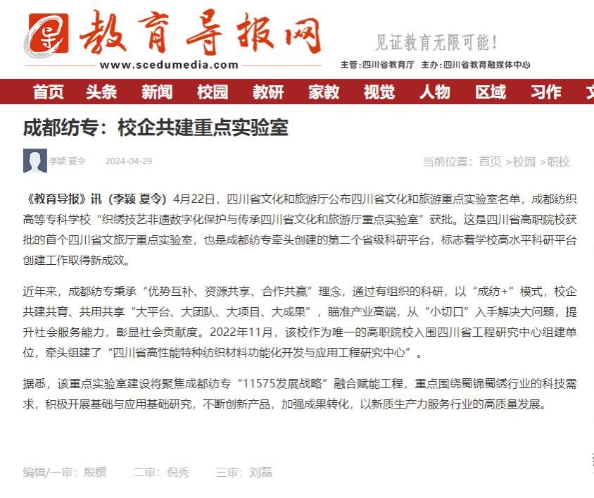 《教育导报》讯(李颖 夏令)4月22日,四川省文化和旅游厅公布四川省文化和旅游重点实验室名单,bwin手机客户端“织绣技艺非遗数字化保护与传承四川省文化和旅游厅重点实验室”获批。这是四川省高职院校获批的首个四川省文旅厅重点实验室,也是成都纺专牵头创建的第二个省级科研平台,标志着学校高水平科研平台创建工作取得新成效。