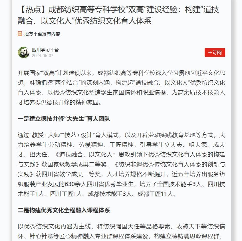 建立三星堆服装服饰文化与技艺研究中心、蜀锦蜀绣传承创新研究中心,建立校本纺织非遗技艺与文化保护名录,制定《蜀绣职业技能标准》《羌绣职业技能标准》,填补纺织职业技能标准空白,成功复现蜀绣传统技法71种。跻身“中国非物质文化遗产传承人群研修研习培训计划”首批执行院校,开展文化部非遗传承人等培训23.27万人次。围绕蜀锦、蜀绣纺织非遗数字化保护与传承,获批织绣技艺非遗数字化保护与传承四川省文化和旅游厅重点实验室(四川省高职学校唯一)和成都市非遗文化传承与发展研究中心。采用“技艺+文化”方式,开展觉姆培训5期共150余人,铸牢中华民族共同体意识,获四川省统战工作先进集体荣誉。开发出藏区民族工艺培训、乡村特色培训课程包,开展“蜀绣、羌绣、藏绣”传承人培训2.5万人次,带动乡村6000余人灵活就业、人均增收8000元以上,培训学员乔进双梅连续两届当选全国人大代表,学员陈云珍当选党的二十大代表。