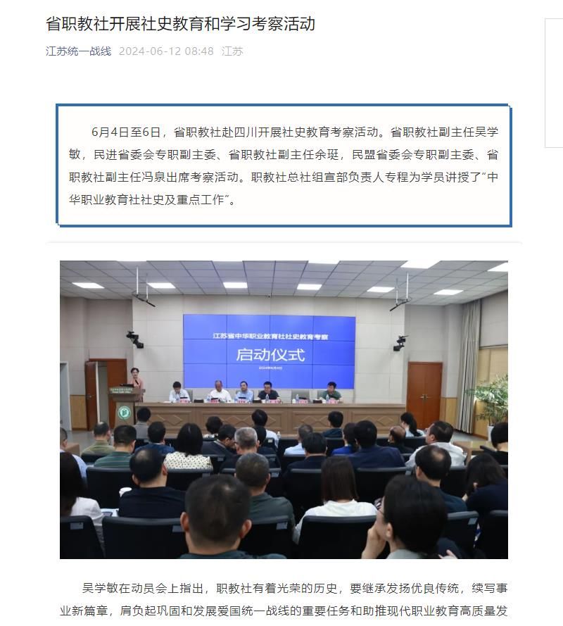 6月4日至6日,省职教社赴四川开展社史教育考察活动。省职教社副主任吴学敏,民进省委会专职副主委、省职教社副主任余珽,民盟省委会专职副主委、省职教社副主任冯泉出席考察活动。职教社总社组宣部负责人专程为学员讲授了“中华职业教育社社史及重点工作”。