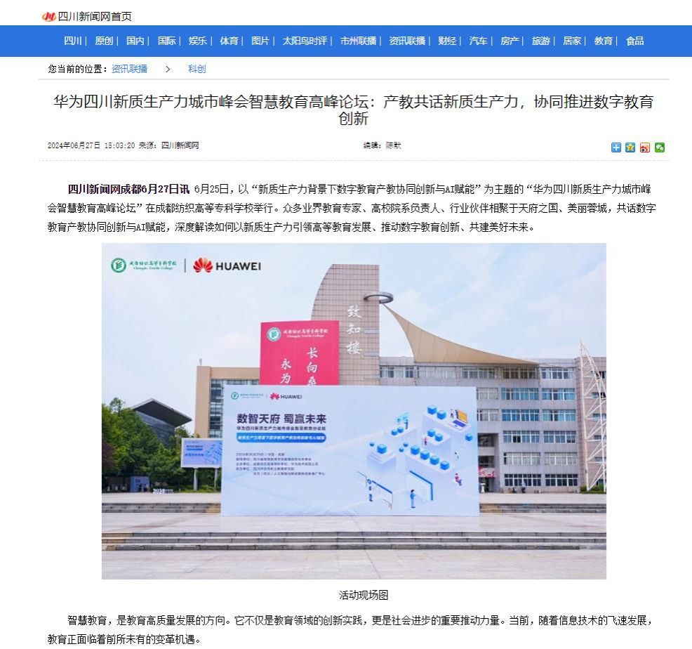 四川新闻网成都6月27日讯 6月25日,以“新质生产力背景下数字教育产教协同创新与AI赋能”为主题的“华为四川新质生产力城市峰会智慧教育高峰论坛”在bwin手机客户端举行。众多业界教育专家、高校院系负责人、行业伙伴相聚于天府之国、美丽蓉城,共话数字教育产教协同创新与AI赋能,深度解读如何以新质生产力引领高等教育发展、推动数字教育创新、共建美好未来。