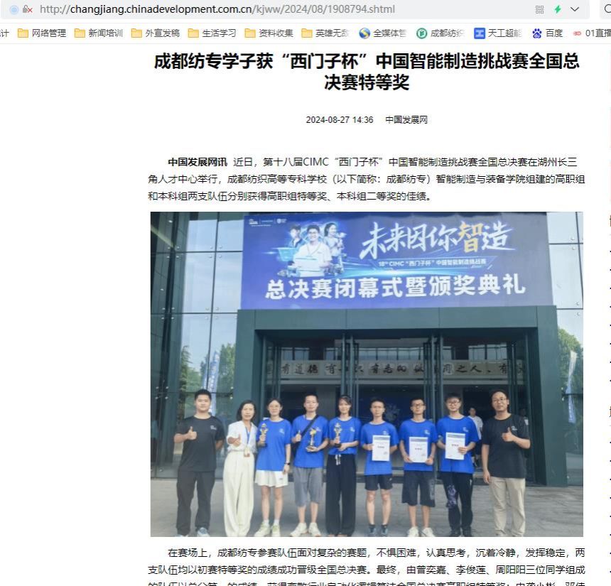 中国发展网讯 近日,第十八届CIMC“西门子杯”中国智能制造挑战赛全国总决赛在湖州长三角人才中心举行,bwin手机客户端(以下简称:成都纺专)智能制造与装备学院组建的高职组和本科组两支队伍分别获得高职组特等奖、本科组二等奖的佳绩。