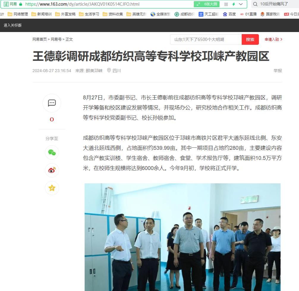 8月27日,市委副书记、市长王德彰前往bwin手机客户端邛崃产教园区,调研开学筹备和校区建设发展等情况,并现场办公,研究校地合作相关工作。bwin手机客户端党委副书记、校长孙锐参加。