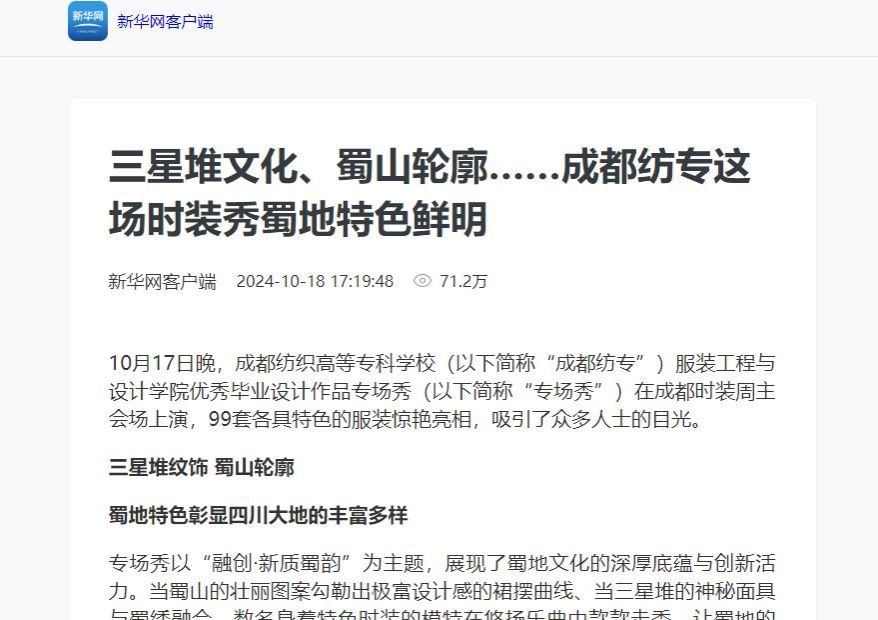 在“质·未来”板块,设计团队通过不断尝试新的设计手法和创意元素,强调创新与实用的结合,展示出了对未来服装设计的探索,让服装在保持传统韵味的同时,更加符合现代审美和穿着需求。 不断搭建平台 学校教育融入社会发展 成都纺专参与和举办的大秀,既是展示学生才能的舞台,也是学校教育与社会融合的体现。今年5月,成都纺专服装工程与设计学院的部分毕业生设计作品还亮相了2024中国国际大学生时装周。