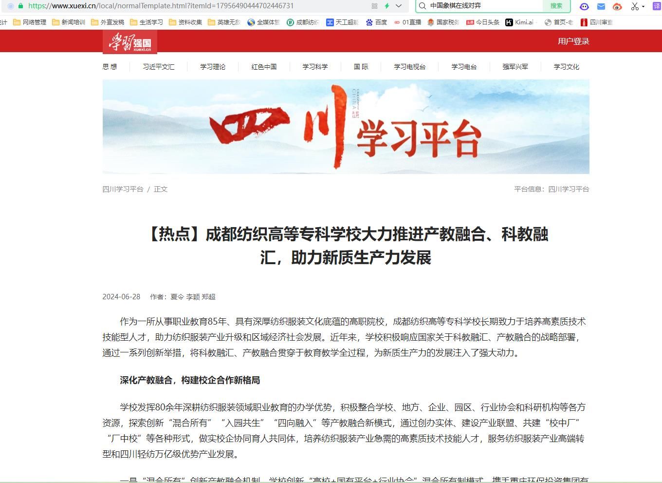 学校发挥80余年深耕纺织服装领域职业教育的办学优势,积极整合学校、地方、企业、园区、行业协会和科研机构等各方资源,探索创新“混合所有”“入园共生”“四向融入”等产教融合新模式,通过创办实体、建设产业联盟、共建“校中厂”“厂中校”等各种形式,做实校企协同育人共同体,培养纺织服装产业急需的高素质技术技能人才,服务纺织服装产业高端转型和四川轻纺万亿级优势产业发展。