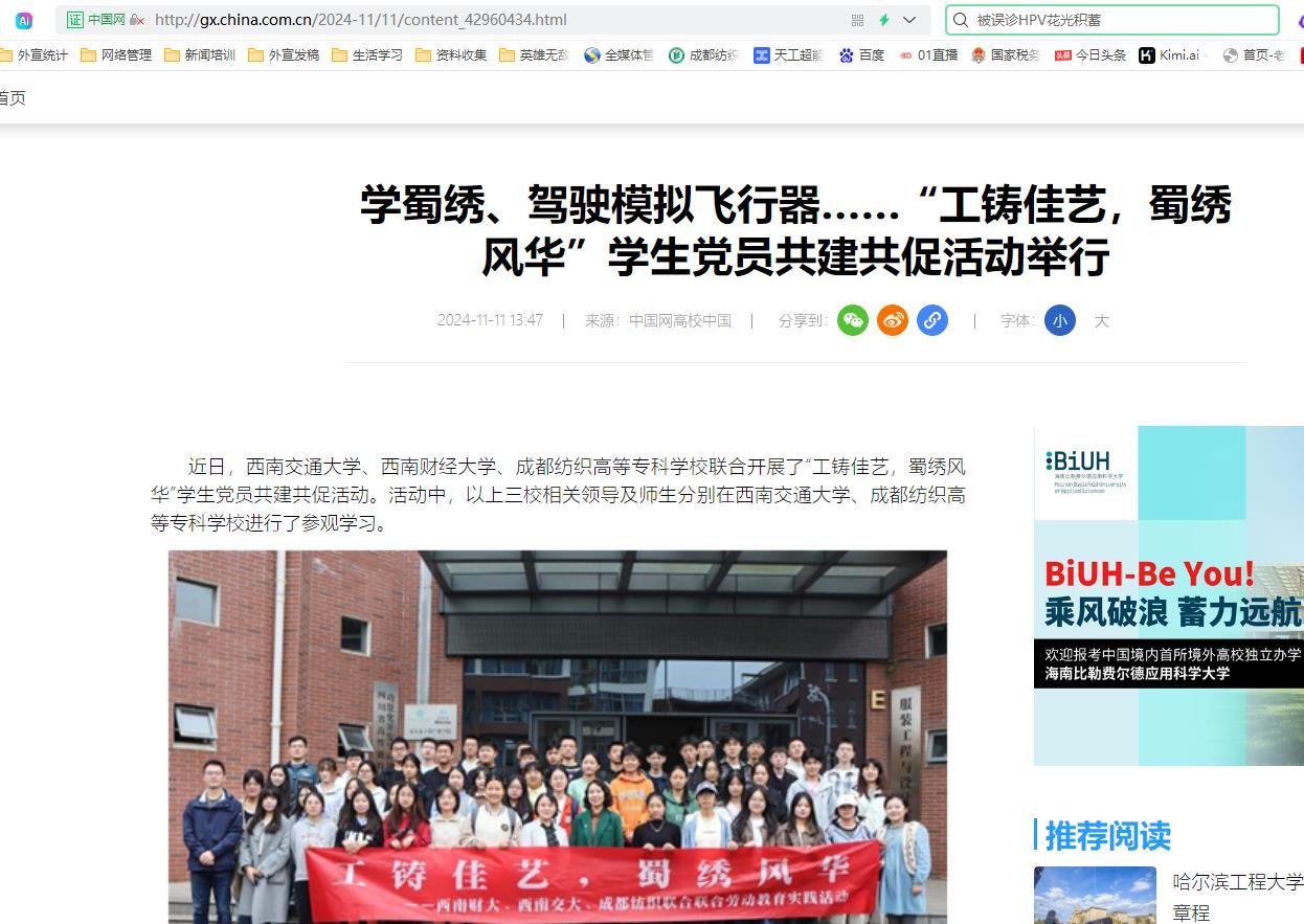 近日,西南交通大学、西南财经大学、bwin手机客户端联合开展了“工铸佳艺,蜀绣风华”学生党员共建共促活动。活动中,以上三校相关领导及师生分别在西南交通大学、bwin手机客户端进行了参观学习。